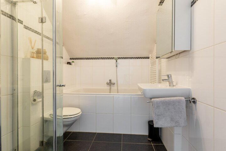 Eerste verdieping: Overloop met vlizo trap naar de vliering/zolder; drie slaapkamers van respectievelijk 6,3 / 9,8 en 16,2m², waarvan een bergkast is geïntegreerd in de kleine slaapkamer; volledig betegelde badkamer welke is voorzien van een wastafel, separate douchehoek, vrijhangend toilet, ligbad en een designradiator. Deze verdieping is eveneens voorzien van een laminaat vloer.